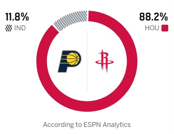 今天,ESPN預(yù)測(cè)本場(chǎng)比賽勝率,火箭88.2%占據(jù)大優(yōu)勢(shì),步行者11.8%。