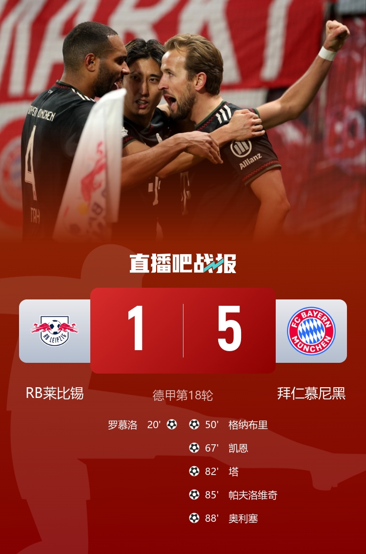 1月18日訊 德甲第18輪,RB萊比錫坐鎮(zhèn)主場萊比錫紅牛競技場迎戰(zhàn)拜仁慕尼黑。上半場,羅慕洛先拔頭籌,努薩錯失良機。易邊再戰(zhàn),格納布里、凱恩破門,迪奧曼德失單刀,塔、帕夫洛維奇、奧利塞連進三球,穆西亞拉復(fù)出送助攻。最終拜仁5-1萊比錫。積分榜方面,拜仁50分以11分優(yōu)勢領(lǐng)跑,萊比錫32分第四。