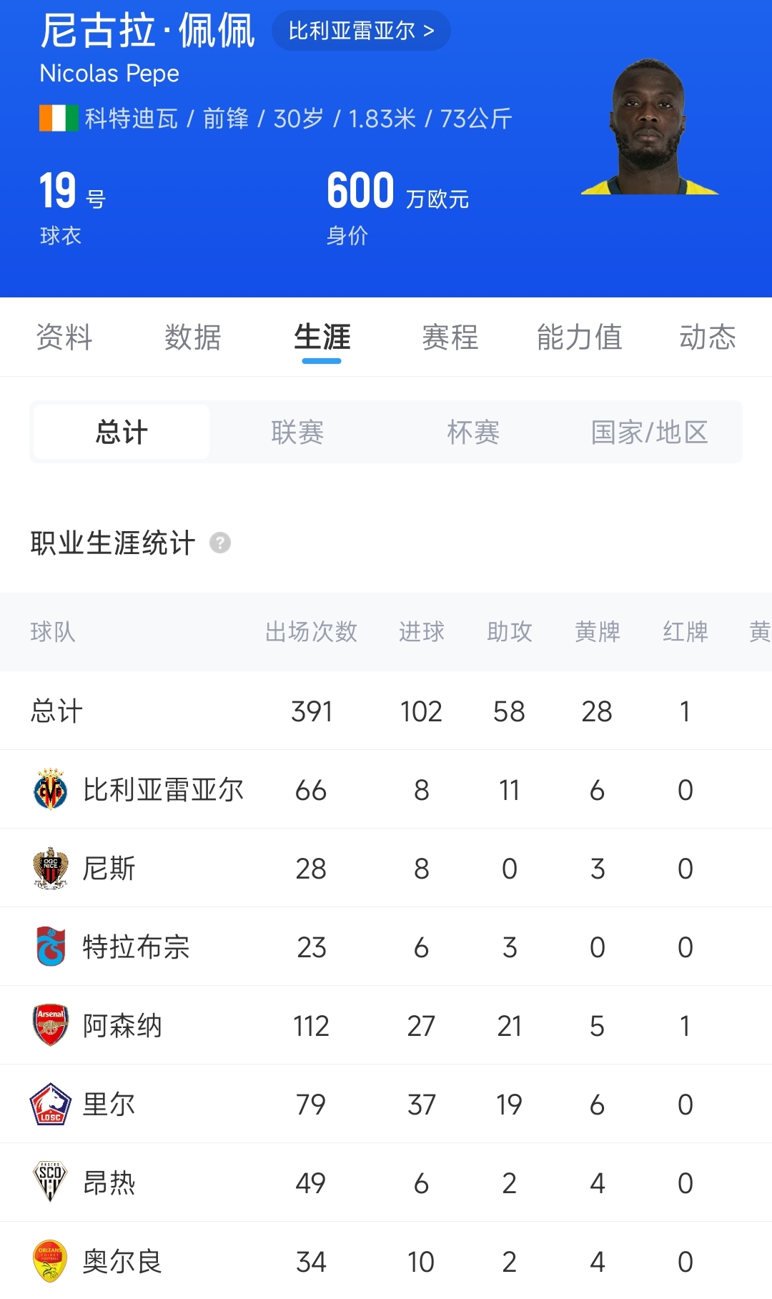 佩佩最為人熟知的一段經(jīng)歷是效力阿森納時(shí)期。2019年阿森納花費(fèi)8000萬(wàn)歐元,從里爾簽下在法甲表現(xiàn)出色的佩佩,當(dāng)時(shí)他的身價(jià)高達(dá)7500萬(wàn)歐元。效力槍手3年時(shí)間,佩佩共為阿森納出戰(zhàn)112場(chǎng)比賽,打進(jìn)27粒進(jìn)球,送出21次助攻,2023年阿森納提前一年與佩佩解約。