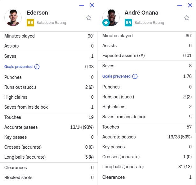 本場(chǎng)比賽,埃德森1次撲救(1次撲救禁區(qū)內(nèi)的射門(mén))、2次成功出擊,19次觸球,5次長(zhǎng)傳4次成功,獲評(píng)6.9分。奧納納8次撲救(4次撲救禁區(qū)內(nèi)的射門(mén))、2次成功出擊、2次高球攔截,57次觸球,31次長(zhǎng)傳12次成功,1次解圍,獲評(píng)8.4分全場(chǎng)最高。