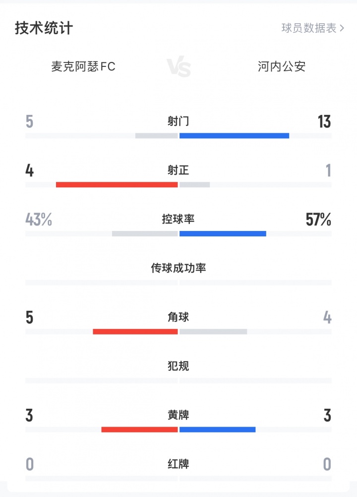 11月06日訊 亞冠二級(jí)E組第4輪,麥克阿瑟2-1擊敗河內(nèi)公安,4輪2勝1平1負(fù)積7分升至小組第一。國安vs大埔的比賽將于今晚20:15開賽。積分榜↓全場(chǎng)數(shù)據(jù)↓