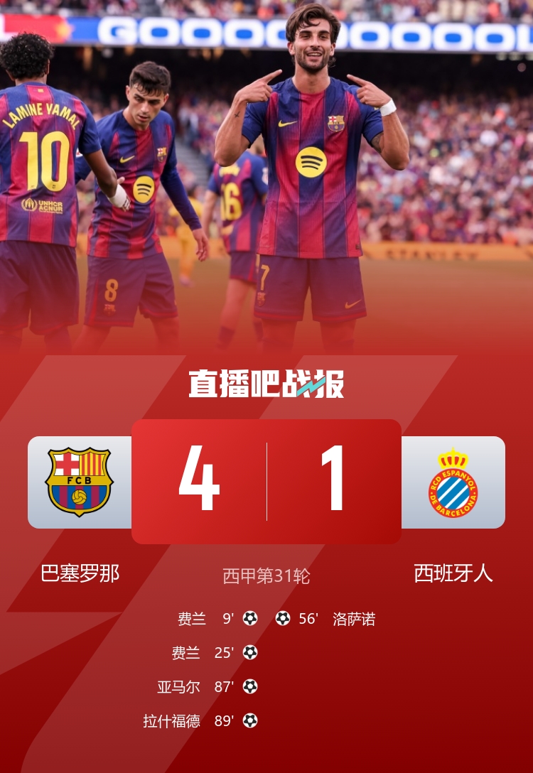 4月12日訊 北京時間4月12日00:30,西甲第31輪巴塞羅那迎戰(zhàn)西班牙人的比賽在諾坎普球場進行,上半場亞馬爾助攻費蘭頭球破門閃擊得手,隨后亞馬爾再度助攻費蘭推射破門擴大比分,德米特洛維奇獻精彩撲救,半場結(jié)束,巴薩2-0西班牙人。下半場洛薩諾爆射扳回一城,德米特洛維奇出擊解圍失誤,亞馬爾推射空門,德容助攻拉什福德建功,最終巴薩4-1西班牙人聯(lián)賽7連勝9分領(lǐng)跑。