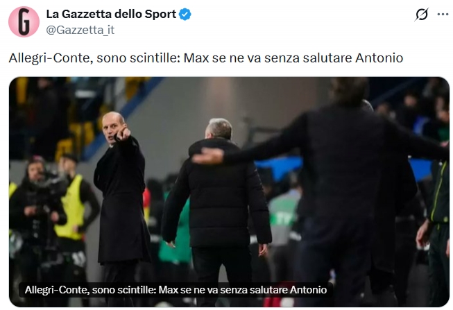 比賽結(jié)束后,阿萊格里徑直走回更衣室,未與孔蒂握手致意??椎賱t留在場上向?qū)κ种乱猓c阿萊格里的長期助手馬爾科·蘭杜奇以及米蘭球員們握了手。