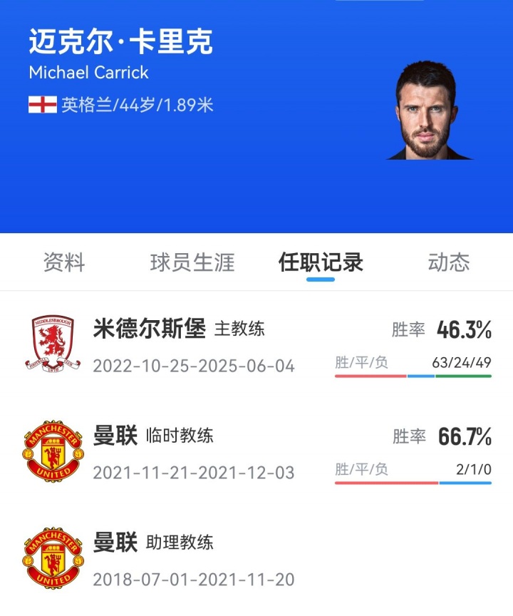 卡里克球員時期在曼聯(lián)效力12年,2018年在曼聯(lián)退役后就在球隊擔任助教,輔佐索爾斯克亞。2021年索爾斯克亞下課后,卡里克擔任臨時主帥帶隊3場,曼聯(lián)取得2勝1平的戰(zhàn)績,之后朗尼克接手曼聯(lián),卡里克也離開了教練組。