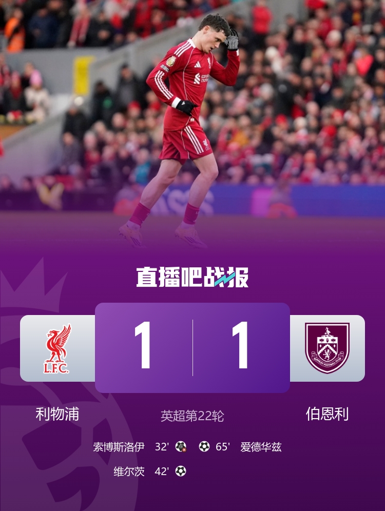 1月18日訊 北京時(shí)間1月17日23點(diǎn),英超第22輪,利物浦在主場(chǎng)安菲爾德球場(chǎng)迎戰(zhàn)伯恩利。上半場(chǎng),加克波造點(diǎn),索博點(diǎn)射中框,維爾茨打破僵局。下半場(chǎng),加克波絕佳機(jī)會(huì)被漢弗萊斯門線解圍,愛德華茲扳平比分,此后利物浦多次制造威脅但都未能破門。最終利物浦1-1伯恩利。本場(chǎng)比賽過后,利物浦積36分重新回到聯(lián)賽第四的位置,伯恩利積14分排在聯(lián)賽倒數(shù)第三。