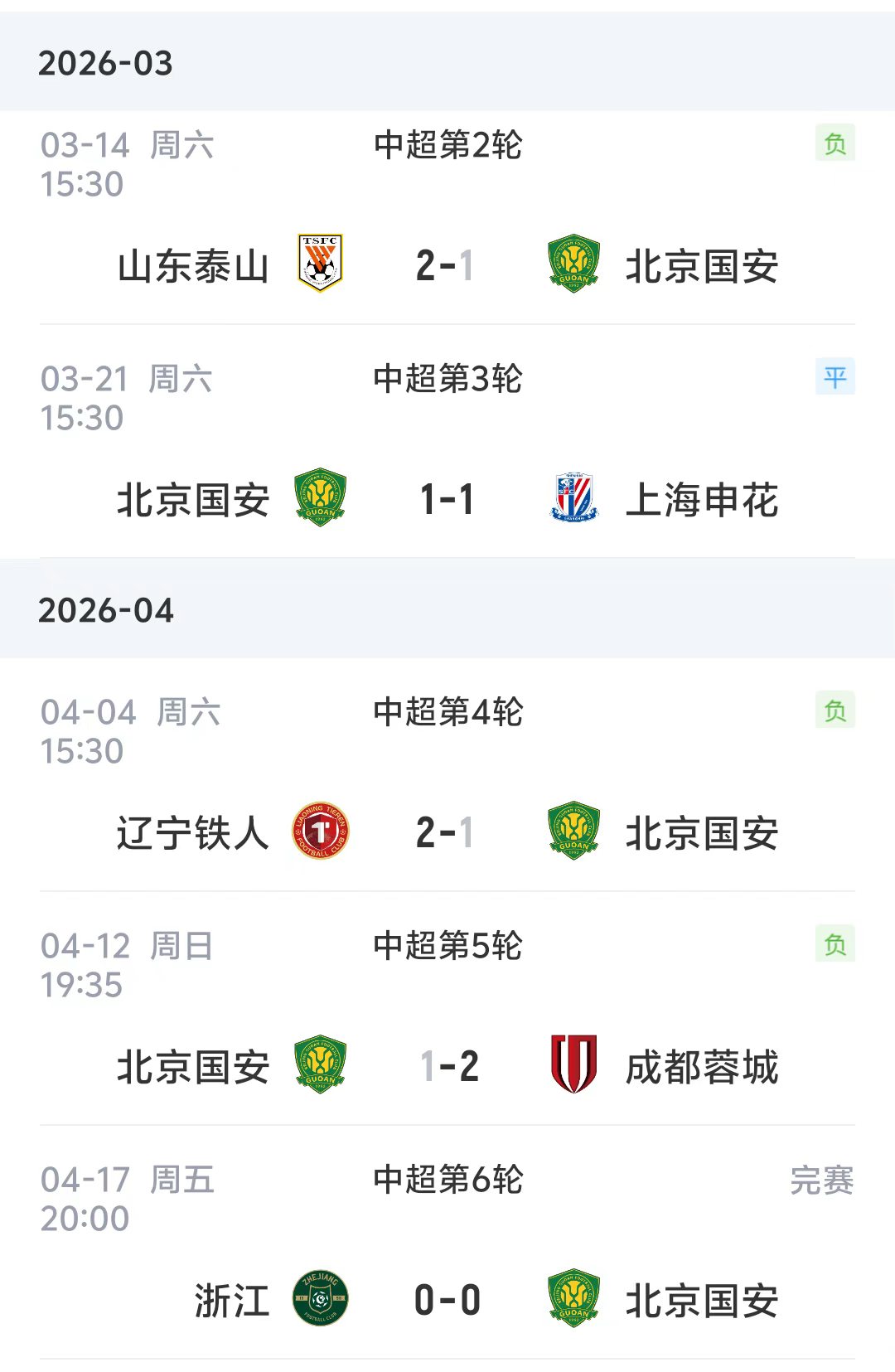 04月17日訊 中超第6輪,北京國安客場(chǎng)0-0戰(zhàn)平浙江,聯(lián)賽五輪不勝,積分由-1轉(zhuǎn)為0分。